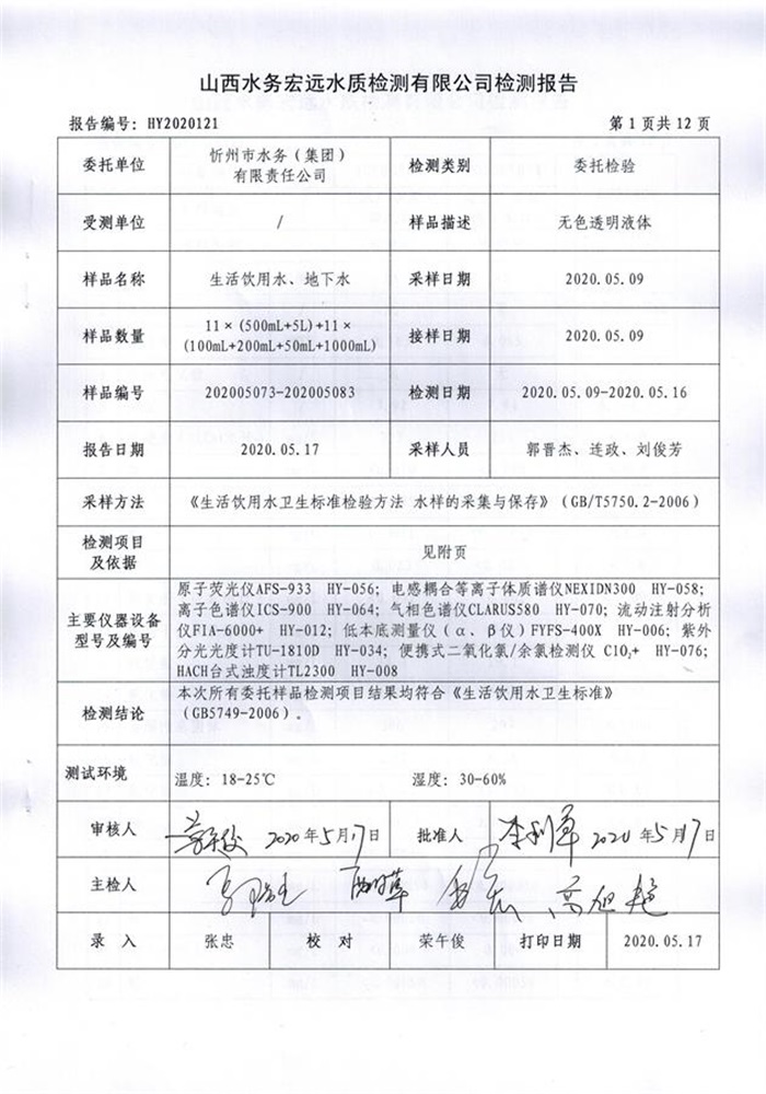 忻州城區(qū)公共供水水源水、出廠水、管網水、管網末梢水2020年5月份水質信息公示